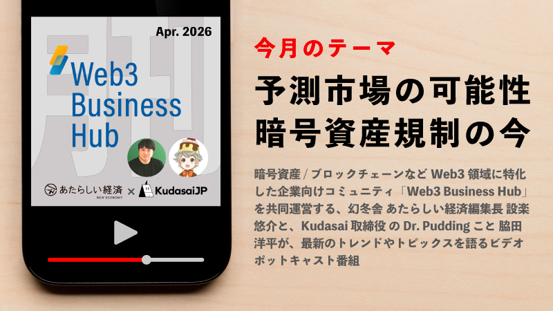 暗号資産/ブロックチェーンなどWeb3領域に特化した企業向けコミュニティ「Web3 Business Hub」を共同運営する、幻冬舎 あたらしい経済編集長 設楽悠介と、Kudasai 取締役 の Dr. Pudding こと 脇田洋平が、最新のトレンドやトピックスを語るビデオポットキャスト番組です。