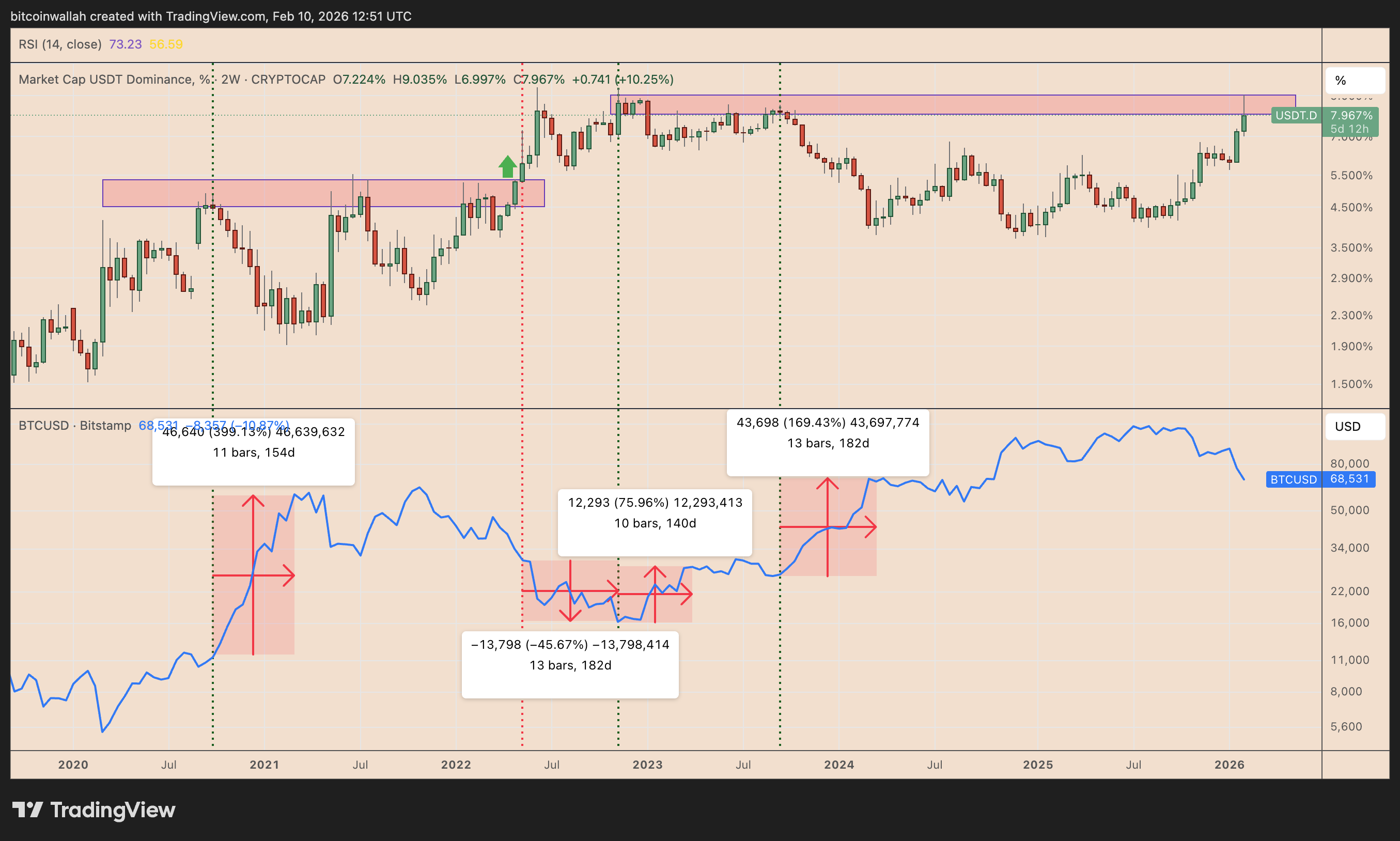 USDT dominance broke above that range in May 2022, and Bitcoin then fell by 45%, further reflecting the inverse correlation between the two.