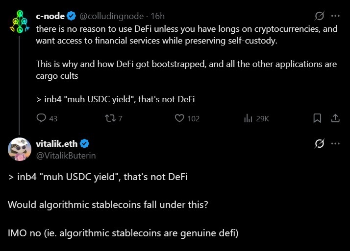 In a discussion on X, Buterin said that DeFi derives its value from changing how risk is allocated and managed, not simply from generating yield on centralized assets.