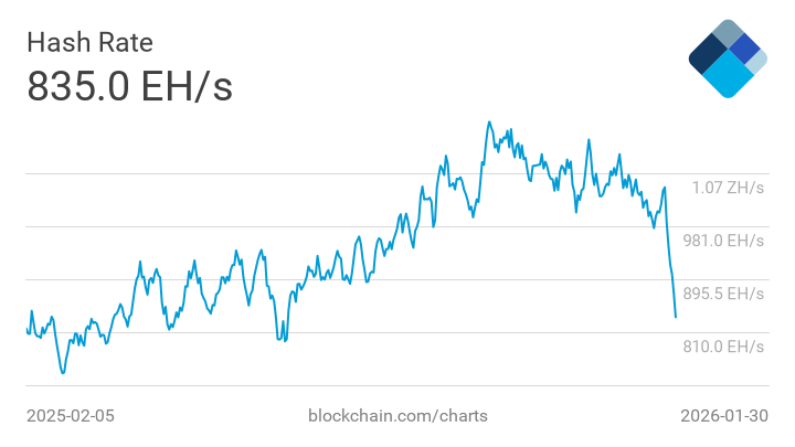 Additionally, Bitcoin’s total network hash rate has dropped 12% since the November 2025 highs, the largest decline since 2021, which suggests possible miner capitulation underway at current prices.