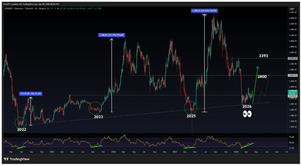 The current 2026 low, printed in February around $1,800, appears to be setting up along the same structural sequence, with the projected path on the chart showing ETH targeting $2,800 as the first recovery level and then an extension to $3,393.