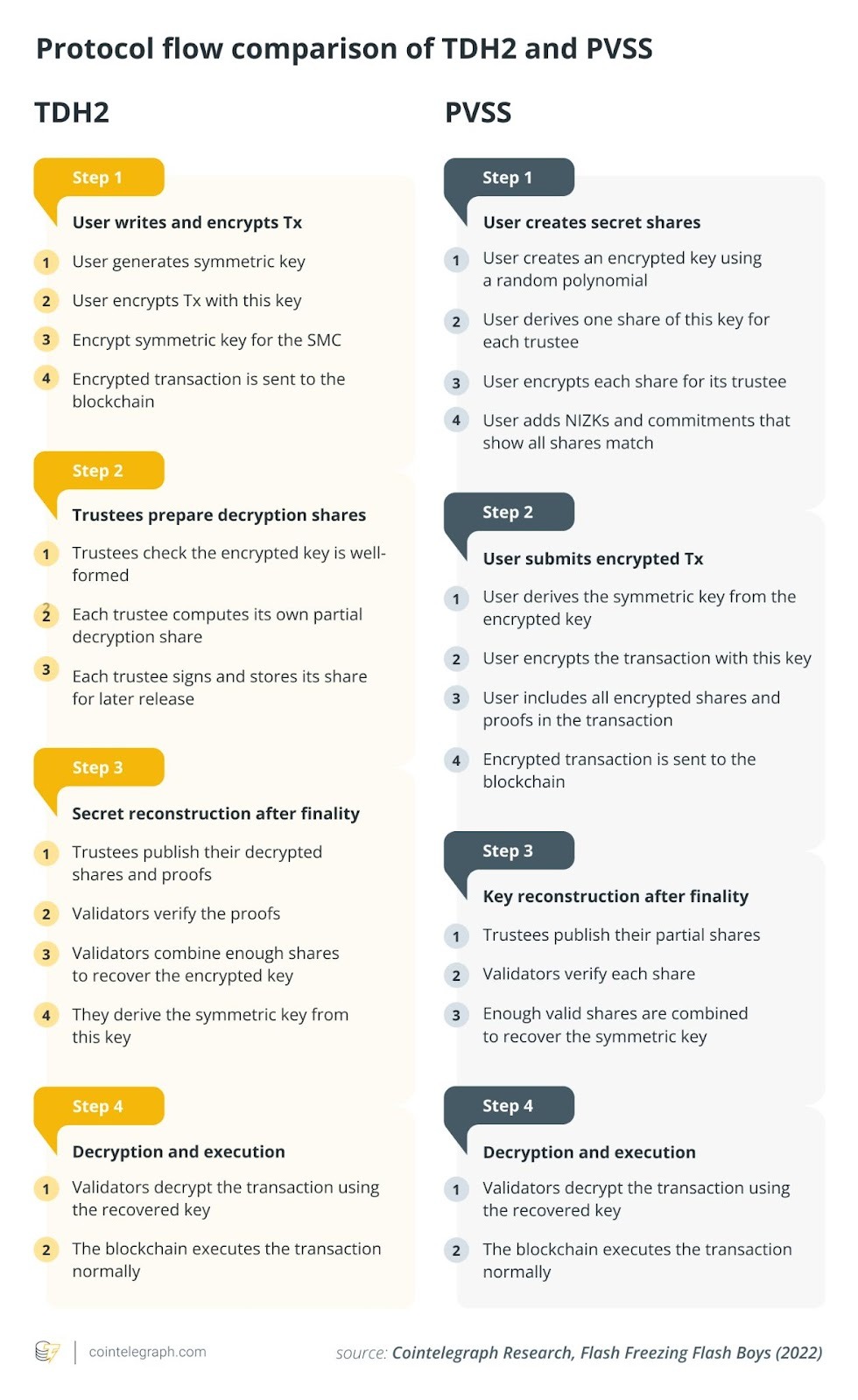 TDH2 (Threshold Diffie-Hellman 2) relies on a committee that runs a distributed key generation (DKG) process to produce individual key shares along with a collective public key. Then, a user creates a fresh symmetric key, encrypts their transaction with it, and encrypts that symmetric key to the committee’s public key. The consensus group writes this encrypted pair onto the chain. After the chain reaches the required number of confirmations, committee members publish partial decryptions of the encrypted symmetric key together with NIZK (Non-Interactive Zero-Knowledge) proofs, which are required to prevent chosen-ciphertext attacks, where attackers submit malformed ciphertexts to try to trick trustees into leaking information during decryption. NIZKs guarantee the user’s ciphertext is well-formed and decryptable, and also that trustees submitted correct decryption shares.  Consensus verifies the proofs and, once a threshold of valid shares is available, reconstructs and decrypts the symmetric key, decrypts the transaction, and then executes it.