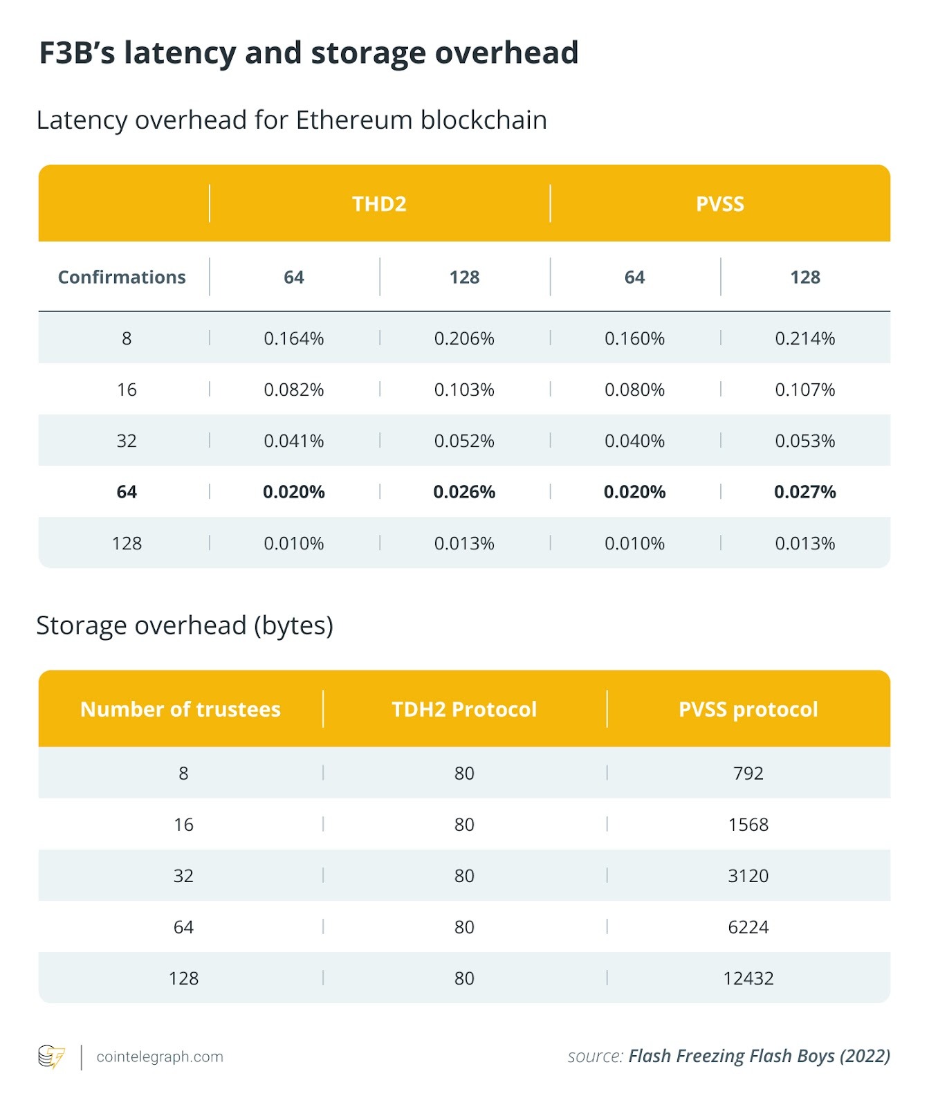 The TDH2 protocol is more efficient due to a fixed committee and constant-size threshold-encryption data. PVSS, by contrast, gives users more flexibility, since they can select the committee members responsible for their transaction. However, this comes at the cost of larger public-key ciphertexts and higher computational overhead due to per-trustee encryption. In the greater scheme of things, the prototype implementation of the F3B protocol on simulated proof-of-stake Ethereum showed that it has minimal performance overhead. With a committee of 128 trustees, the delay incurred after finality is only 197 ms for TDH2 and 205 ms for PVSS, which is equivalent to 0.026% and 0.027% of Ethereum’s 768-second finality time. Storage overhead is just 80 bytes per transaction for TDH2, while PVSS’s overhead grows linearly with the number of trustees due to per-member shares, proofs and commitments. These results confirm that F3B could deliver its privacy guarantees with negligible impact on Ethereum’s performance and capacity.