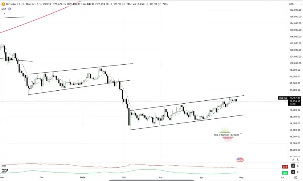 Brandt 认为,当前 BTC ($77,024.00 · Live) 走势为通道形态,而非看涨底部反转模式。此形态虽不排除进一步上涨,但缺乏强劲底部信号。