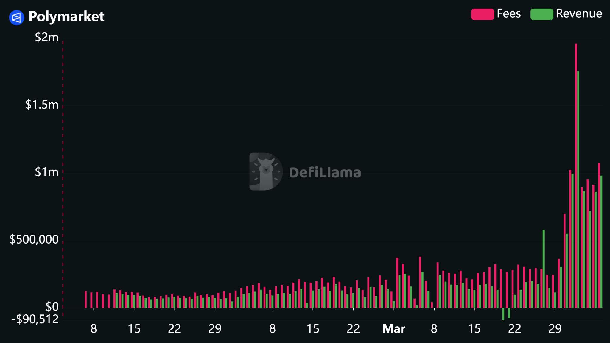 Polymarket’s fees and other revenue have climbed sharply since the end of March. Source: DeFiLlama