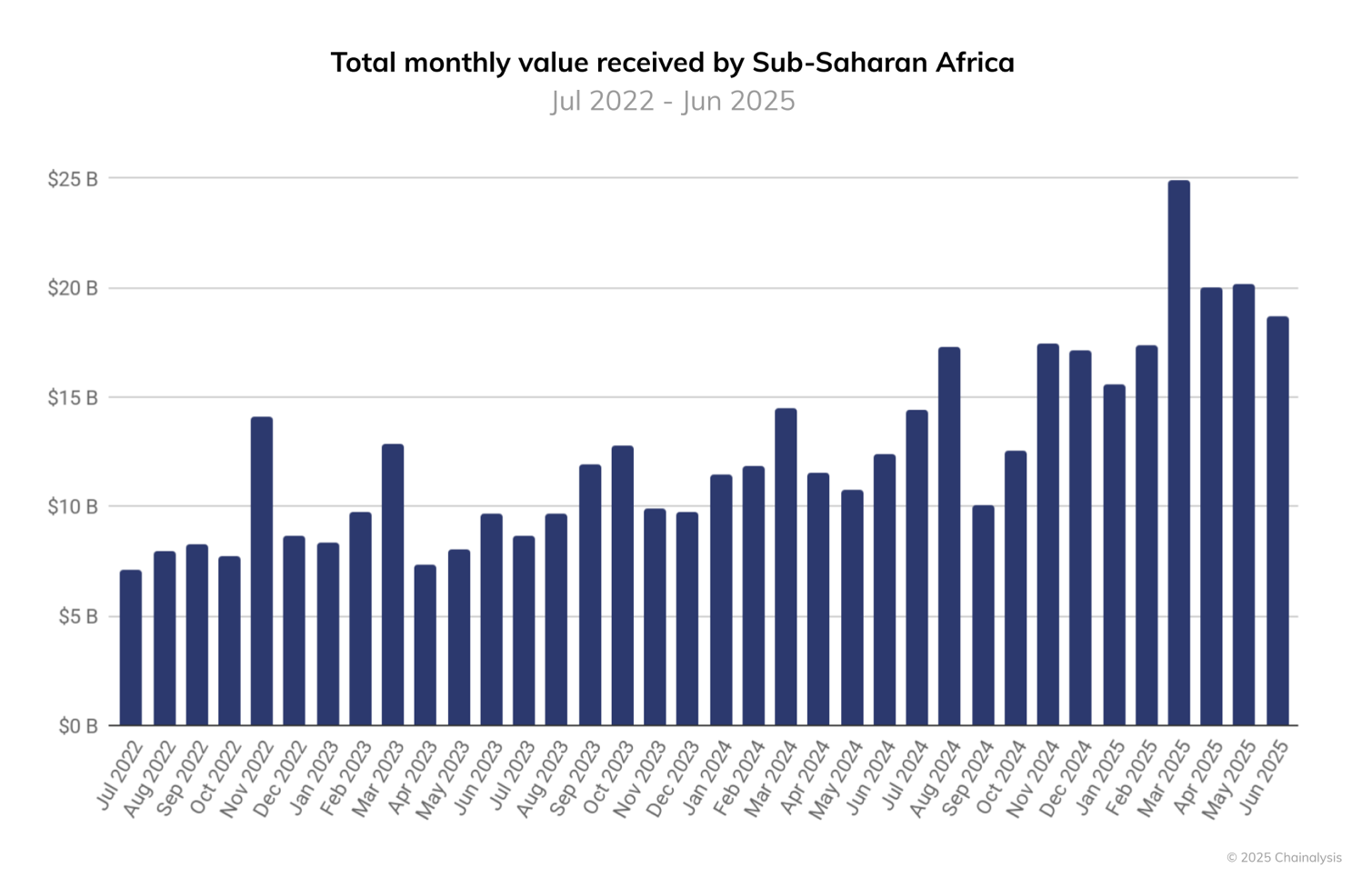 A Chainalysis report in September showed that Sub-Saharan Africa is among the world’s fastest growing regions for crypto adoption. The region received more than $205 billion in onchain value from July 2024 to June 2025, a roughly 52% increase year over year, ranking it third worldwide.