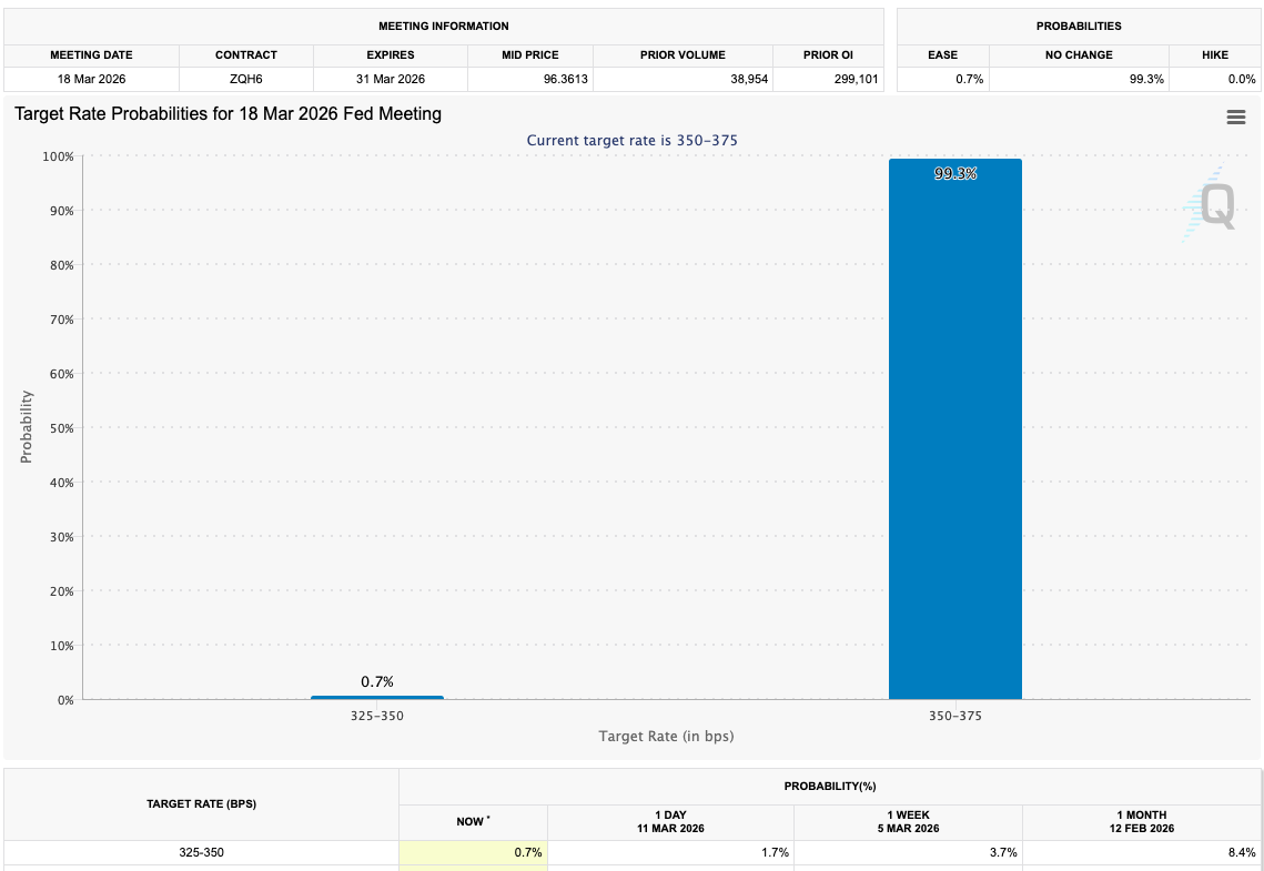 The latest data from CME Group’s FedWatch Tool showed the odds of an interest-rate cut at the Fed’s March 18 meeting — a key potential crypto tailwind — at less than 1%.
