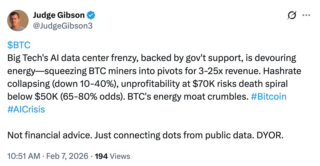 In a Saturday post on X, analyst Judge Gibson said that the growing AI data center demand is already forcing Bitcoin miners to pivot, which has led to a 10-40% drop in hash rate.