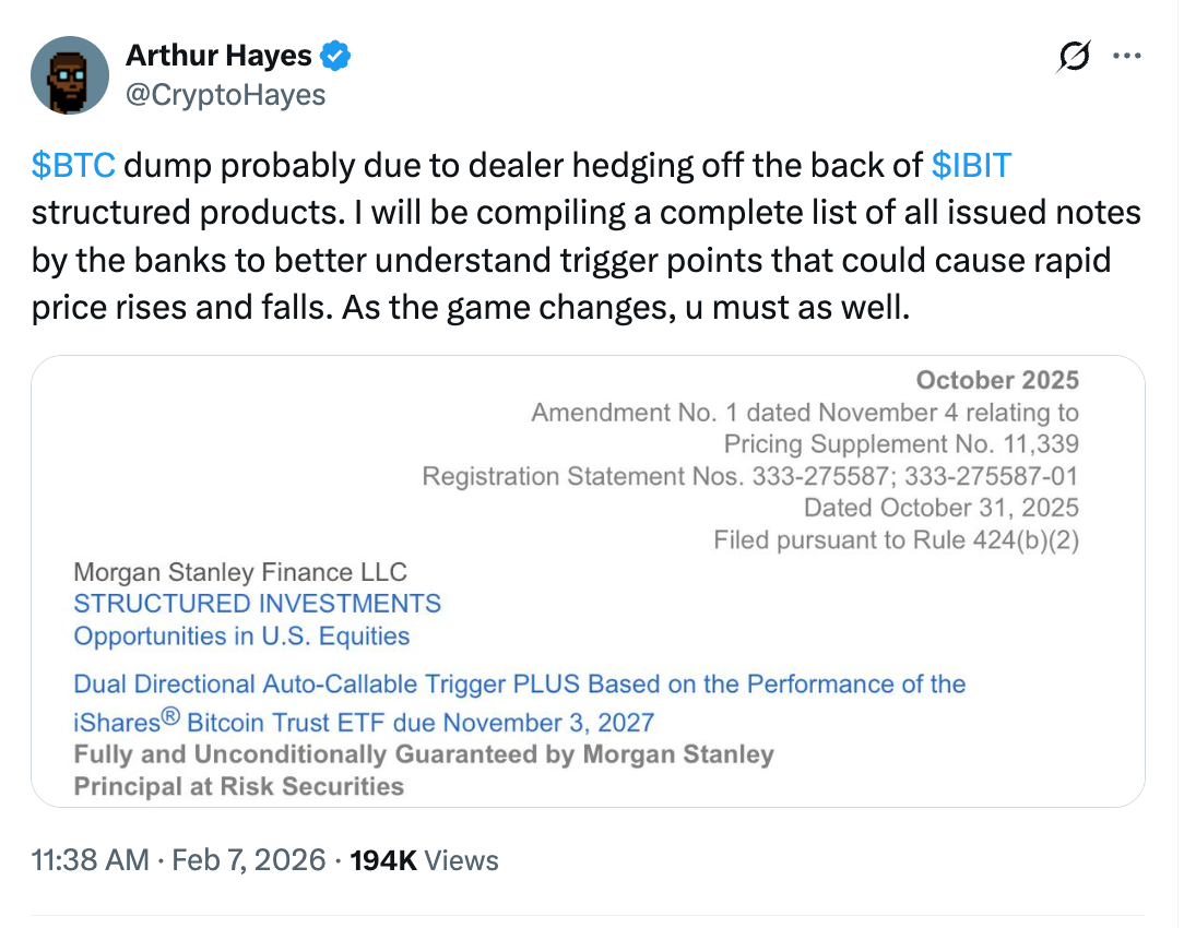 He suggested that banks, including Morgan Stanley, may have been forced to sell Bitcoin (or related assets) to hedge their exposure in structured notes tied to spot Bitcoin ETFs, such as BlackRock’s IBIT.