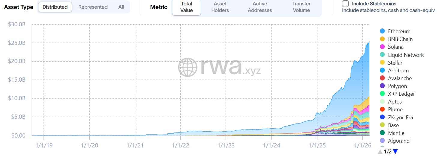 Ethereum has been widening its lead as the distribution layer for RWAs, excluding stablecoins. Source: RWA.xyz
