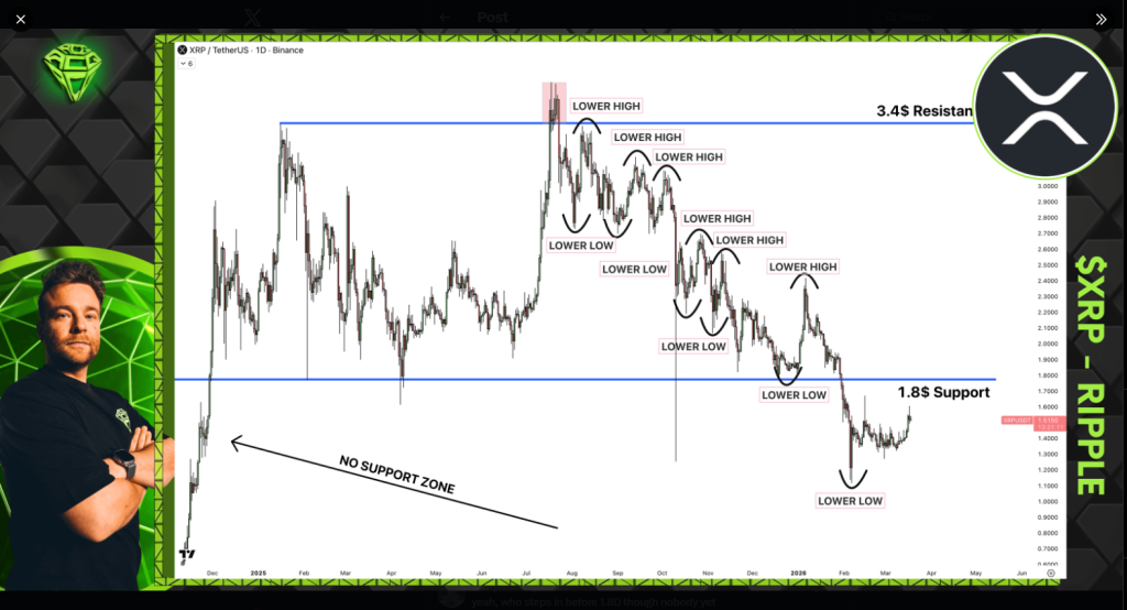 The level he flags on the downside is the $1.20 to $1.30 zone. That area offered no resistance during XRP’s explosive November 2024 rally, which is what analysts call a “no support zone” — a price range the market blew through so fast that few buyers established positions there.